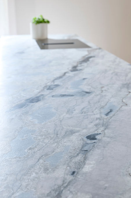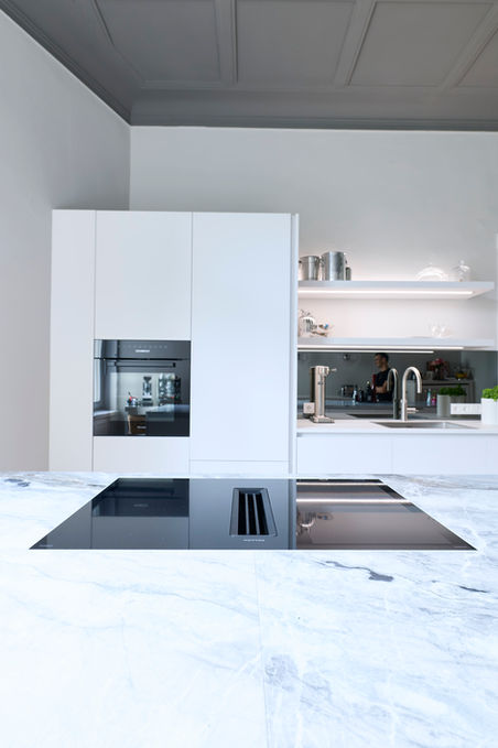 In diesem Projekt wurde Weiß ganz bewusst gewählt – nicht als Farbe, sondern als Bühne. Die reduzierte Küchenarchitektur schafft Raum für das Besondere: eine expressive Natursteinplatte mit kunstvollem Aderverlauf. So wirkt das Weiß wie ein Passepartout, das dem Material Raum gibt, zu wirken – ganz wie in einem Gemälde. Eine Küche, die durch Zurückhaltung überzeugt und dabei maximal ausdrucksstark ist.