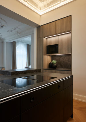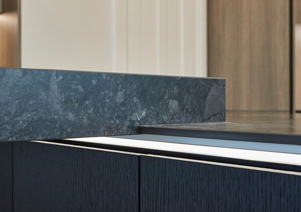 Jeder Blickwinkel unserer Küchen offenbart die Symbiose aus Design und Funktion. Die Fronten im Trondheim Stil, gepaart mit edlen Neolith Keramikakzenten, schaffen eine Atmosphäre, die einlädt und inspiriert. Entdecken Sie, wie Langlebigkeit und Stil Hand in Hand gehen können.